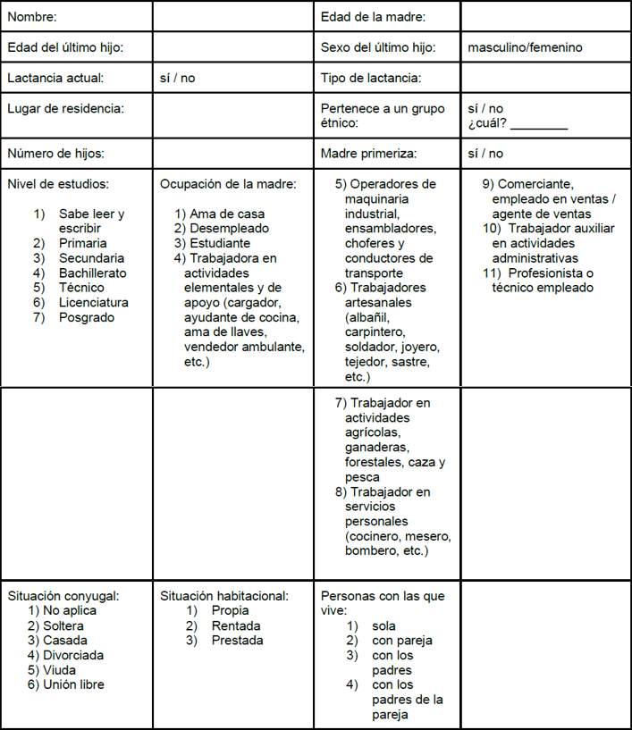 1) Para usted, ¿cuál ha sido su experiencia con la lactancia materna? 1.1 Usted, ¿cómo se imagina que sea la experiencia de dar lactancia materna? 2) Para usted, ¿qué ha sido lo más desagradable de dar lactancia materna? 2.1 Usted, ¿qué piensa que sea lo más agradable de dar lactancia materna? 3) ¿Qué beneficios conoce de dar lactancia materna para usted? 4) ¿Qué beneficios conoce de dar lactancia materna para su bebe? 5) ¿Ha tenido alguna experiencia desagradable dando lactancia materna en su hogar o fuera de él? 5.1 ¿Usted se imagina en algún momento tener una experiencia desagradable dando lactancia materna dentro o fuera de su hogar? 6) ¿Qué ha sido lo más desagradable de dar lactancia materna? 6.1 ¿Usted qué piensa que sea lo más desagradable de dar lactancia materna? 7) ¿Por qué decidió dar lactancia materna? 7.1 ¿Usted piensa dar lactancia materna a su hijo? 8) ¿Alguien le ha recomendado abandonar la lactancia materna? 8.1 ¿Alguien le ha recomendado no dar lactancia materna? 9) ¿Se siente usted satisfecha con el crecimiento y desarrollo de su hijo?9.1 ¿Usted cree que su hijo tenga un crecimiento y desarrollo favorable con la lactancia materna? 10) ¿Considera usted que pueda trabajar y a la vez dar lactancia materna a su bebé? ¿Por qué? 11) ¿Usted piensa o ha escuchado que hay alimentos que no puede estar consumiendo durante su embarazo o en etapa de lactancia?