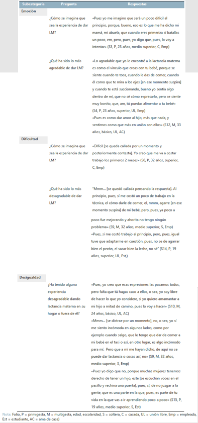 La Tabla 2 presenta los principales aspectos socioculturales alrededor de la lactancia materna; la emoción, el conocimiento y el apego son las subcategorías identificadas con mayor predominio. Se presentan las respuestas representativas y la identificación de la participante según sus datos sociodemográficos.