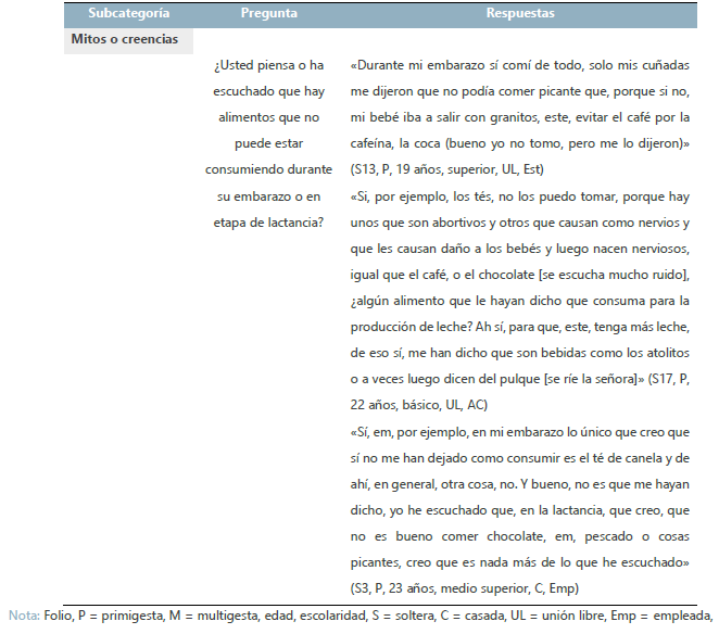 De lo anterior se desprende que los mitos o las creencias llegan a tener un impacto importante sobre la lactancia. Algunas participantes mencionaron cierto tipo de alimentos o bebidas prohibidos durante el embarazo o la lactancia; otras afirmaron no prescindir de ningún tipo de alimentos, ya que no experimentaron problemas relacionados; otras más investigaron la veracidad de lo que les habían dicho para, con el conocimiento suficiente, decidir si consumir o no los alimentos cuestionados.