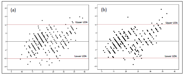 Finally, the reliability of the prediction models was internally tested by using the Bland-Altman diagram, evaluating the agreement between the HGS measured by the dynamometer and the HGS predicted by the equation. For all tests, a statistical significance level of 5 % was applied.