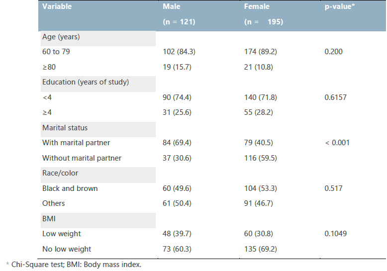 Data were collected from 316 individuals (11.2 % of losses related to refusals, non-location, or non attendance of the participant), 61.7 % of whom were female. The sociodemographic characteristics of the sample are shown in Table 1. Regarding the age group, 84.3 % of the older adults were between 60 and 79 years old, and the mean age was 70.4 years (±7.3), 70.2 (±6.9) among women and 70.6 (±7.8) among men, without significant difference between sexes. Most older adults have a marital partner (51.6 %), have fewer than four years of study (72.8 %) and self-reported to be black or brown (51.9 %). As for the BMI classification, low weight was present in 34.2 % of the older adults.