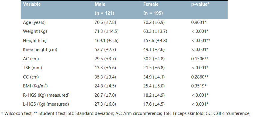 The R-HGS mean was 22.2kg (±7.7), where 28.7kg (±7.0) among men and 18.2 kg (±4.9) women, with a significant difference between the sexes (p<0.001), while the L-HGS mean was 21.3kg (±7.3), 27.3kg (±6.8) among men and 17.6kg (±4.5) among women (p<0.001). Similarly, men had significantly higher values in the anthropometric variables weight, knee height, height and TSF (Table 2).