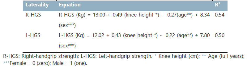 The equations proposed for predicting HGS of the community-dwelling older adults are described in Table 4. The adjusted model with the best result for R-HGS [F(3.312) = 124.0; p < 0.001; R² = 0.544] was consisted of the variables age (Beta = -0.271; t = -6.648; p < 0.001), knee height (Beta = 0.494; t = 4.405; p < 0.001) and sex (Beta = 8.339; t = 10.526; p < 0.001) and for L-HGS [F(3.312) = 106.3; p < 0.001; R² = 0.505] by the variables age (Beta = -0.223; t = -5.570; p < 0.001), knee height (Beta = 0.432; t = 3.932; p < 0.001), and sex (Beta = 7.800; t = 10.040; p < 0.001).
