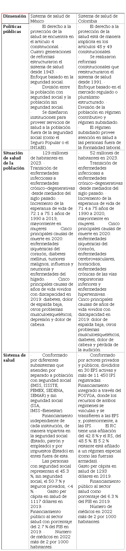 Elaboración propia con base en los datos de Constitución Política de los Estados Unidos Mexicanos (1917); Constitución Política de la República de Colombia (1991); Organización para la Cooperación y el Desarrollo Económico (2016); Chertorivski (2011); Muñóz (2002); Santana (2011); Secretaría de Salud (2019); Reyes et al. (2019); Instituto Nacional de Estadística y Geografía (s.f., 2021, 2023); Soto et al. (2016); Institute for Health Metrics and Evaluation (s.f.); Organization for Economic Cooperation and Development y The World Bank (2023); Ramírez (2013); Bernal y Barbosa (2015); Guerrero et al. (2011); Londoño y Frenk (1997); Ministerio de Salud y Protección Social (s.f., 2022); Chávez (2022); Departamento Administrativo Nacional de Estadística (s.f.); Idrovo et al. (2008); Banco Mundial (s.f.); Gutiérrez (2023).La dimensión de políticas de salud de ambos países es similar, pero existen diferencias importantes, la más relevante es el enfoque. En México, está inclinado a la seguridad social como eje principal de prestación de servicios de salud; en Colombia existe un mercado regulado. Si bien, ambos países enfatizan la responsabilidad del Estado de suministrar y velar por la salud de la población, en Colombia ha sido más marcada la necesidad de afiliar a las personas sin trabajo formal; en contraste, en México esta afiliación no comenzó sino hasta el año 2003. Aun así, ambos han aumentado el porcentaje de afiliación.