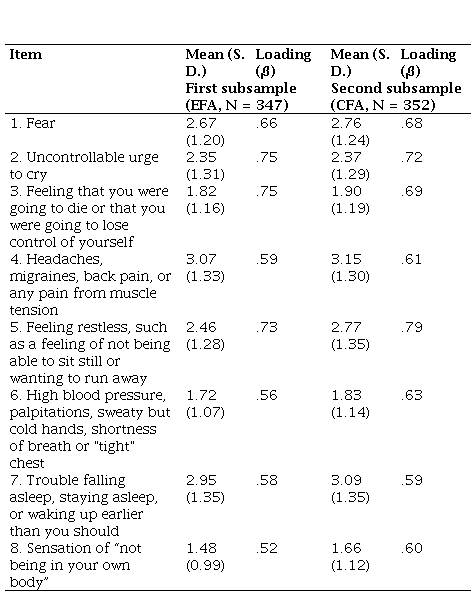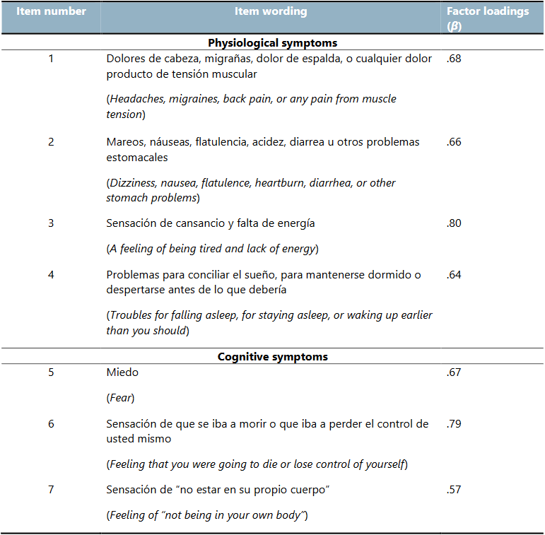 In a sample of N = 358, using a confirmatory factor analysis, two alternative models were defined, one one-dimensional and the other two-dimensional, based on the a priori categorizations of a team of psychology researchers on the dimensionality of the items. The aim was to compare which of the two models, one-dimensional or two-dimensional, fitted the data better. This was done following methodological considerations outlined by Kline (2011). For this, nested models were specified: in model 1, without constraints, two factors were specified, one on physiological symptoms of acute stress, which were specified to load on a set of four items, and another on cognitive symptoms of acute stress, which were specified to load on a set of three items. In model 2, constraints were set on model 1 in such a way that the variances of the two factors and the covariance between them were constraint to be equal. This specifies that all items are indicators of a single factor (one-dimensional model). The fit of both models was compared using the chi square difference test. The two-dimensional model obtained an “acceptable” fit: χ2/df = 1.67, CFI = .99, RMSEA = .043, 90% CI [.000; .074]. For the physiological symptoms dimension, the loads were between β = .64 and .80; for the dimension of cognitive symptoms, the loads were between β = .57 and .79. For the one-dimensional model, the fit was not acceptable: χ2/df = 5.86, CFI = .90, RMSEA = .116, 90% CI [.093; .140]. The difference was Δꭓ2 (3) 66.167, p<0.001. The loads ranged from β = .48 to .76. From what was presented above we inferred that the two-factor solution is acceptable and superior to the one-dimensional one. Table 5 presents original Spanish items, English translations, and standardized coefficients (β) for each item of the two-dimensional model.