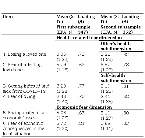 PFS. For the new scale on pandemic-related fears, results from the first subsample, based on an EFA suggested a bidimensional solution: two factors had eigenvalues > 1. The first eigenvalue explained 55.87 % of variance, while the second one explained 17.41 % of variance. Cumulatively, both factors explained 73.29 % of variance. The correlation between these factors was . = .47 (. < .001). Reliability of the health-related fear subscale was . = .85. Reliability of the economy-related fear subscale was . = .75 (.SB = .75). Reliability of these subscales was then considered acceptable. Item-total correlations in the health subscale were between . = .67 and . = .72. In the economic subscale these correlations were . = .59. This is considered excellent (Qin, 2006), and provides further evidence of internal consistency.