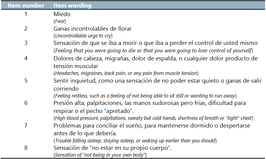 Alternatively, mental health professionals also developed and selected a different set of items, conceptualizing the acute stress as bidimensional (cognitive stress and physiological stress). We also tested them. Results on this are reported in Annex B.