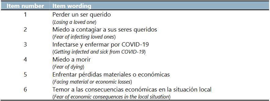 Pandemic-related Fear Scale (PFS). A set of items was elaborated by mental health professionals, including what they deemed as two clusters of concerns related to the COVID-19 Pandemic: (1) concerns on health and (2) economic consequences of the pandemic. Items were introduced by a question (“To what extent do you experience the following fears in the current health emergency?”). There were 4 items focused on health-related fear (e. g.: “become infected and sick from COVID-19”). There were 2 items focused on economy-related fear (e. g.: “Facing material or economic losses”). Response options used a 5-point Likert format, from (1) “totally disagree” to (5) “totally agree”. The complete set of 8 items, in its original Spanish language, and a free translation into English, is presented in Appendix A, Table 4.