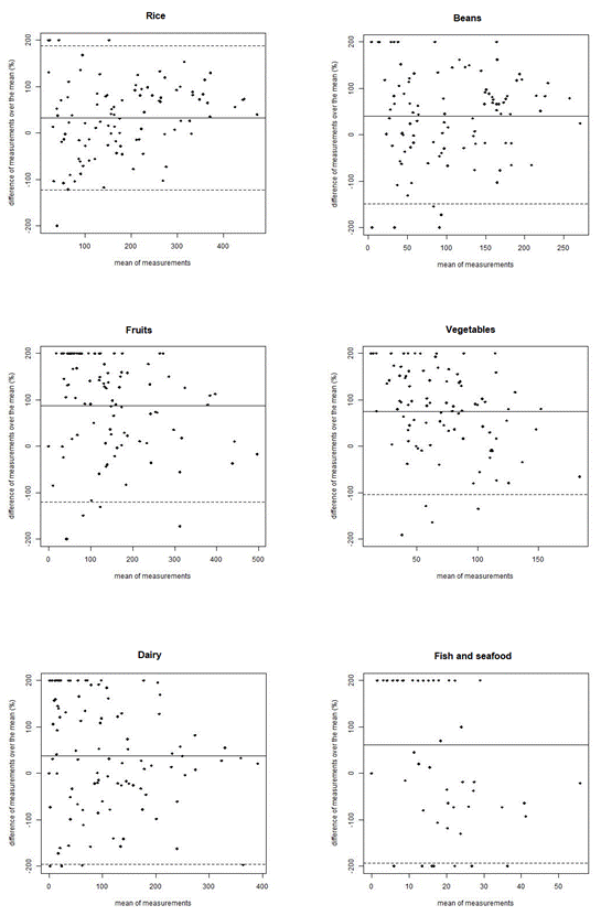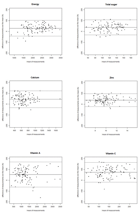 Bland-Altman method (Bland & Altman, 1999) was used to detect systematic differences between two methods. Traditional Bland-Altman plots show heteroscedasticity for most nutrient/food groups, with an increase in variability of the differences from FFQ and 3FR as the magnitude of the measurement increases. Giavarina (2015) suggests, in these cases, to express the differences of measurements under two methods as percentages of the values on the axis (i.e. proportionally to the magnitude of measurements) (Giavarina, 2015). Presenting the plots using the percentage of differences has the advantage that all the plots can be made with the same scale and are more comparable. The scale used in this study ranges from -200 to 200%.