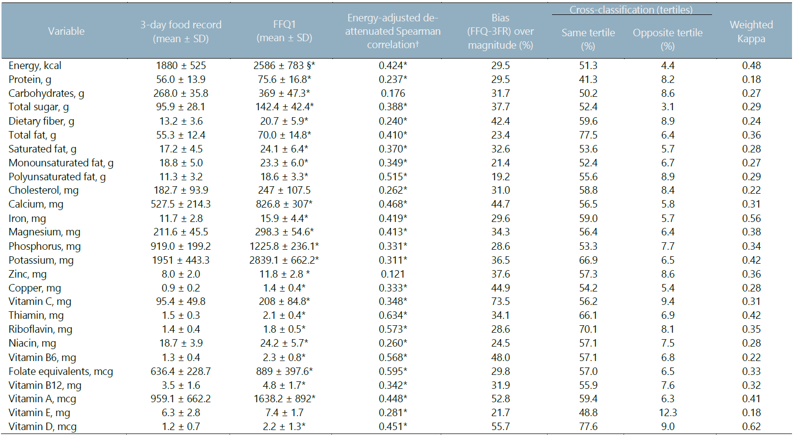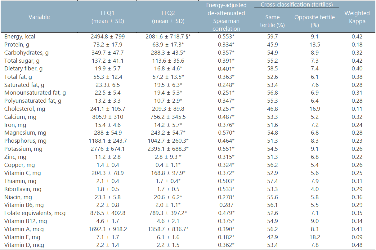 For the reliability of the FFQ, Spearman’s correlation was used to assess the relationship between FFQ1 and FFQ2. Differences between mean food groups consumption and energy-adjusted mean nutrients intake between the FFQ1 and FFQ2 were also compared using the Wilcoxon signed-rank-test. Likewise, the proportion of participants classified by the first and second FFQ in the same/opposite tertile of the intake of nutrients and foods, and the weighted kappa was used to assess the agreement between FFQ1 and FFQ2.