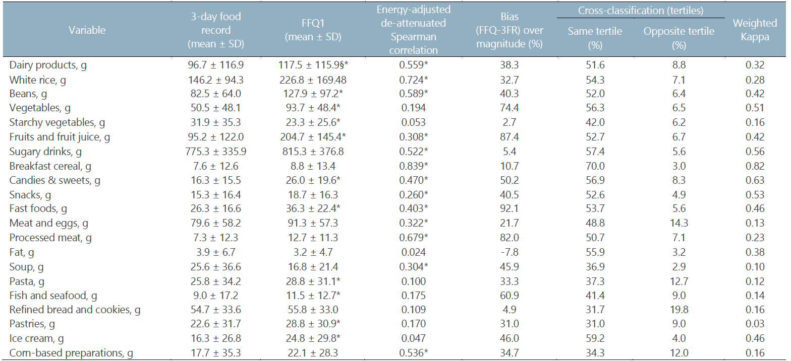Abstract: Introduction: Food Frequency Questionnaires (FFQ) have been widely used in several age groups, including adolescents, due to their greater advantages over other dietary measurement methods. Therefore, this study was designed to assess the validity and reliability of a FFQ designed for use on Costa Rican adolescents. Methodology: The validation and reproducibility studies were carried out in a sample of 107 adolescents of San José province selected through convenience sampling. For validation, a comparison of the nutrient intake and food consumption data obtained with the FFQ was made with those derived from the 3-day food record (3FR). Reliability was assessed by comparing nutrient intake and food consumption derived from the first FFQ with another FFQ performed four weeks after the first. Results: FFQ overestimates 3FR, with an average overestimation of 40.2% for foods and 38.8% for nutrients. The cross-classification was good for 24 of 26 nutrients and for 12 of the 21 food groups, and the weighted kappa showed an acceptable discriminant ability of the FFQ to categorize individuals into broad nutrient intake (except for protein and cholesterol) and food groups categories (dairy products, white rice, beans, vegetables, fruits and fruit juice, sugary drinks, breakfast cereal, candies and sweets, snacks, fast foods, fat, and ice cream). Conclusions: The FFQ designed for Costa Rican adolescents was unable to assess absolute dietary intakes; however, it is a reasonable tool to categorize adolescents into broad ranges of dietary intakes and could be used to evaluate dietary patterns in epidemiological studies of diet-disease associations.
