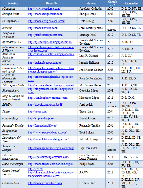 Se han distribuido los distintos espacios en seis categorías (1. Blogs docentes generalista, 2. El reto de las 365 entradas, 3. La voz del alumnado, 4. Docencia e investigación, 5 Espacios de referencia académica y 6. Blogosfera de LIJ y de DLL), que nos permiten partir de los espacios más conocidos y generales a modelos concretos dentro del ámbito de la didáctica de la lengua y la literatura. Además, encontramos desde espacios clásicos, que se lanzaron en la década anterior como espacios de innovación, a propuestas más recientes que nos permiten constatar la vigencia de la herramienta. La siguiente tabla engloba los principales datos de la investigación según el orden de descripción anterior: