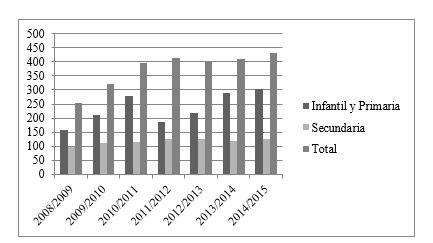 La Figura 1 representa la evolución del número de centros participantes desde el curso 2008/2009 hasta el curso 2014/2015. Salvo en los cursos 2012/2013 y 2013/2014, donde el número de encuestas totales era de 398 y 409 respectivamente, la muestra ha sido más representativa del conjunto de centros educativos (en el curso 2008/2009 intervinieron 255 centros, en el 2009/2010 un total de 322, en el 2010/2011 ascendió a 398 y en el 2011/2012 a 409 centros).