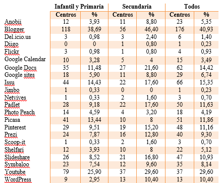 En la dimensión 3, se ha valorado el uso de aplicaciones y herramientas de la web social, concluyendo que el 51,15 % utiliza alguna, siendo la más utilizada el blog, mediante el servicio Blogger (40,93 %). En esta misma línea, un 56,98 % de los centros utiliza redes sociales y canales de información en línea donde destaca Youtube con un 30,47 %, lo que supone un avance con respecto al 42,28 % del curso anterior. En este ámbito, se ha producido un gran avance en estos últimos años ya que según Jiménez (2013) en el curso 2010/2011, tan solo el 19,21 % de las bibliotecas escolares públicas andaluzas y extremeñas contaban con una página web.