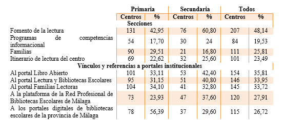 Para evaluar el contenido de esos portales, se han formulado preguntas respecto a las secciones y vínculos que debería contener y las referencias y enlaces a portales institucionales. En las secciones, se han incluido las referentes a actividades de fomento de la lectura (un 48,14 %), programas de competencias informacional (19,53 %), recursos e información para las familias (25,81 %) y el itinerario de lectura del centro (23,49 %). Los porcentajes son siempre más satisfactorios en Educación Secundaria salvo la sección dedicada a las familias presente en un 29,51 % de los centros de Educación Infantil y Primaria y tan solo en un 16,0 % de los centros de Educación Secundaria.