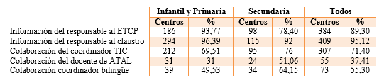 La normativa vigente recoge entre las funciones del responsable la de informar tanto al claustro como al equipo de coordinación pedagógica de las actuaciones de la biblioteca y de recoger las posibles demandas. Este apartado se corresponde con el indicador 3.2 que muestra que el 89,30 % de los responsables han informado en el ETCP y un 95,12 % al claustro. El número es algo inferior en los centros de Enseñanza Secundaria lo que muestra que la coordinación en ese sentido es más estrecha en los centros de Educación Primaria e Infantil. En cuanto a la implicación de otros profesores en la biblioteca, se ha preguntado por la del coordinador TIC (un 71,40 %), el coordinador bilingüe (un 55,30 %) y el docente de ATAL (un 33,41 %).