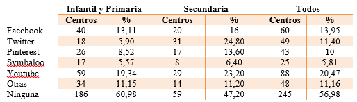 En cuanto a la utilización de redes sociales y otros canales de información, un 56,98 % de los responsables de bibliotecas afirma no usar ninguno. En Primaria el porcentaje es algo superior, un 60,98 % mientras que en Secundaria es de 47,20 %. La red social más popular es Youtube (20,47 %), seguida de Facebook (13,95 %) y Twitter (11,40 %). El grado de utilización por red social y tipo de centro educativo es el siguiente: