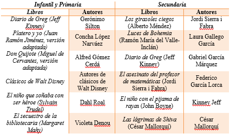 En la dimensión 5, Gerónimo Silton y Roal Dahl se mantienen en los autores más prestados en Educación Primaria en los dos últimos cursos y en Educación Secundaria se mantienen Jordi Sierra i Fabra, Laura Gallego García, Gabriel García Márquez y Federico García Lorca. En cuanto a los títulos de libros, se mantienen en Primaria el Diario de Greg (Jeff Kinney), Platero y yo (Juan Ramón Jiménez, versión adaptada) y Don Quijote (Miguel de Cervantes, versión adaptada) mientras que en Educación Secundaria Los girasoles ciegos (Alberto Méndez) y Luces de Bohemia (Ramón María del Valle-Inclán).