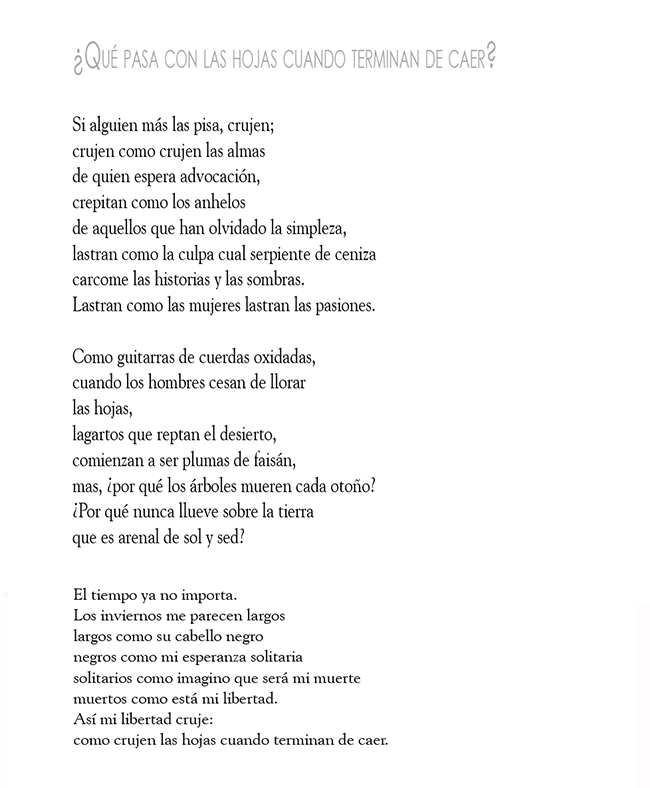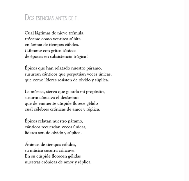 Resumen: Se incluye los poemas "Qué pasa con las hojas cuando terminan de caer?" y "Dos esencias antes de ti". Ambos se refieren a la relación amorosa: el primero está cargado hacia la melancolía; el segundo, al deseo vehemente.