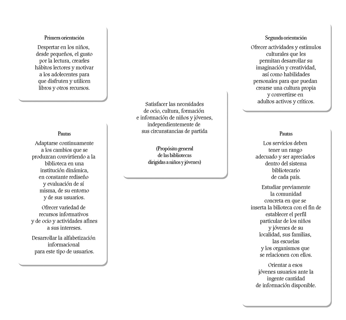 A partir del análisis y consideración de las pautas expuestas en el esquema anterior, las bibliotecas para niños y jóvenes tendrán una guía que encamine el desarrollo de servicios y la conformación de sus colecciones.