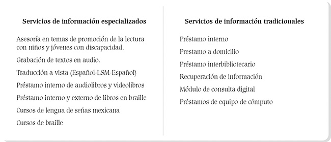 La convergencia de los ámbitos referidos hace posible el establecimiento de servicios de información y la creación de colecciones por parte del IBBY México/A leer. En el rubro de los primeros, tenemos aquellos que se ofrecen tradicionalmente en cualquier biblioteca y algunos que responden a las particularidades tanto etarias como socioculturales de los usuarios de esta unidad de información. El Esquema 2 muestra los servicios de la biblioteca clasificados en dos tipos: tradicionales y especializados.