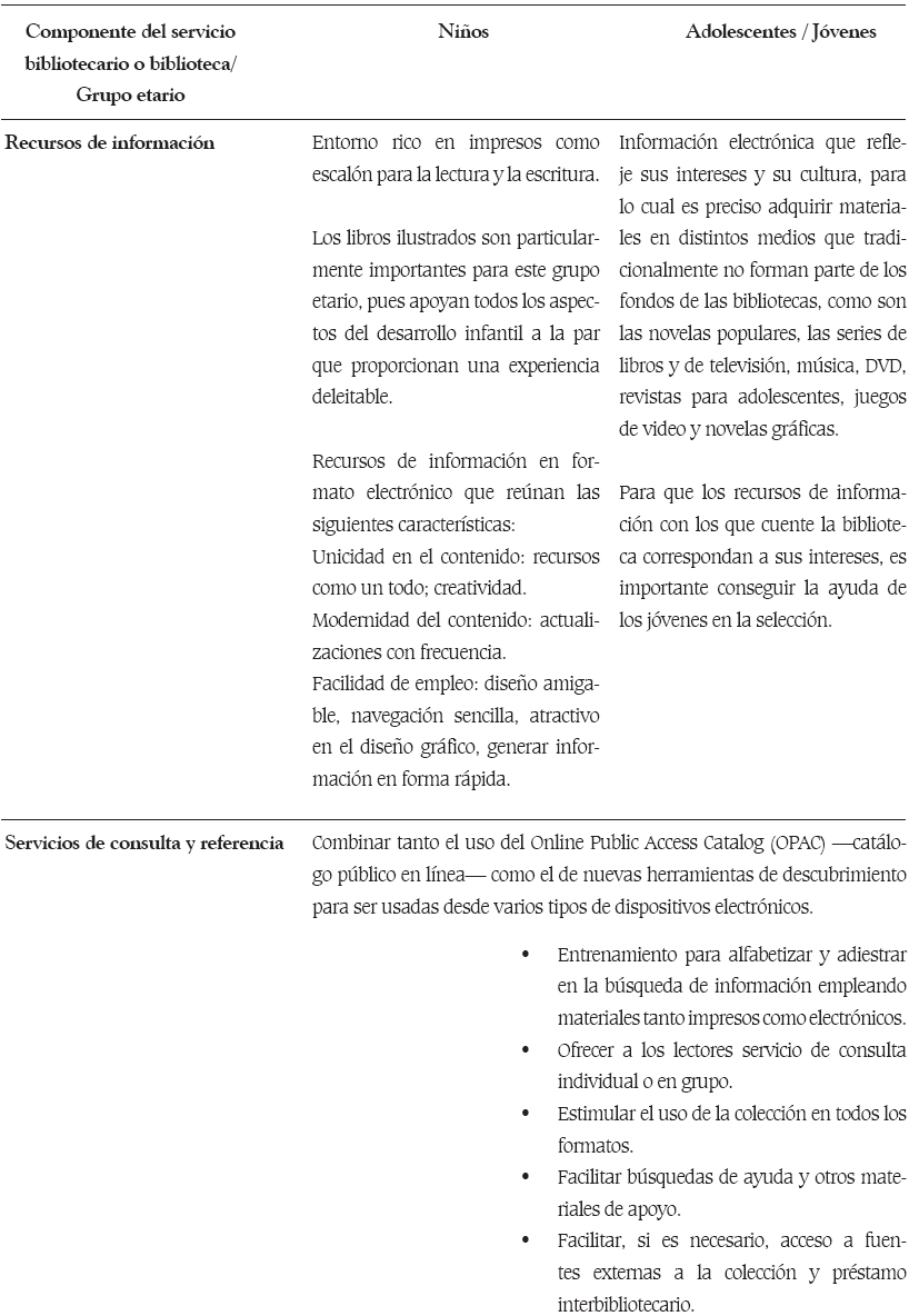 Niños, adolescentes o jóvenes —más cercarnos a los 12-18 años— son el grupo específico para el cual se crean estos servicios bibliotecarios que comprenden: instalaciones, equipos, colecciones y personal especializado. Pero conjugar dos grupos de usuarios en un solo espacio es complicado, de ahí que algunas bibliotecas ofrezcan servicios específicos para adolescentes, en alusión a que sus necesidades informativas se diferencian claramente de las de los niños. En el Cuadro 1 se mencionan las distinciones existentes entre niños y adolescentes en su rol de usuarios deservicios de información y cómo las bibliotecas debensatisfacer estas demandas de modo particular y enciertos momentos convergiendo.
