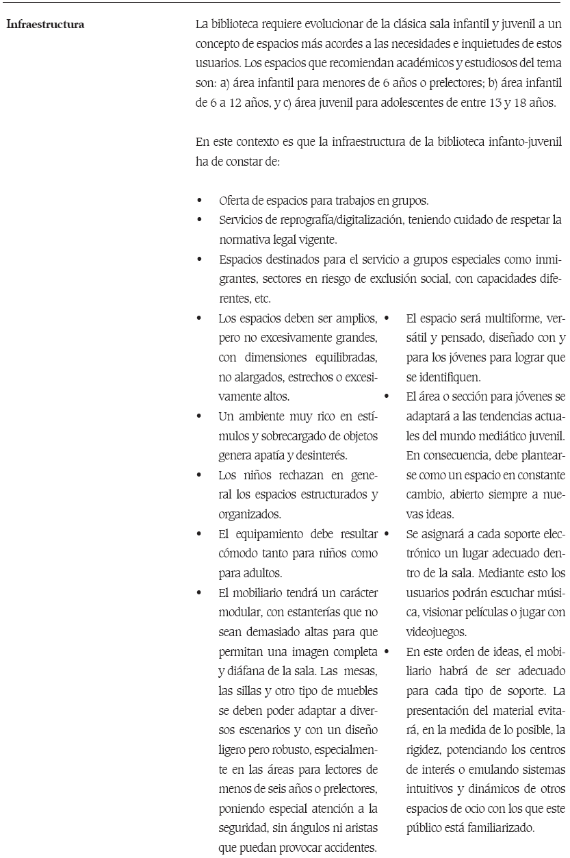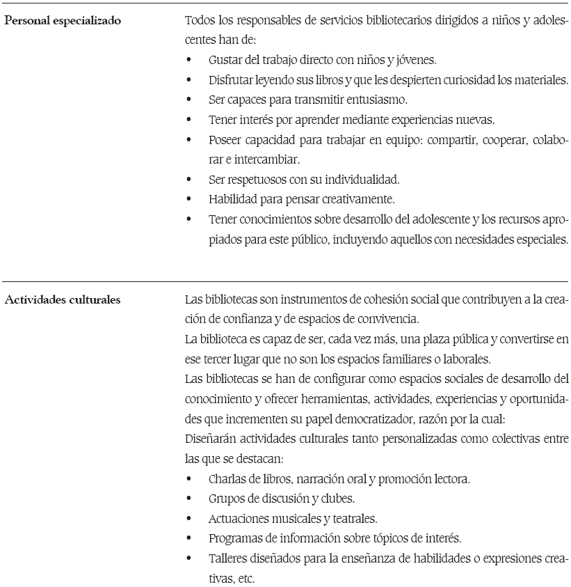 Además de estos componentes que integran el servicio en las bibliotecas de niños y jóvenes, las colecciones son el otro elemento clave, un pilar de la institución. Éstas reunirán características como las siguientes: a) diversidad de contenidos y formatos; b) ser atractiva y de calidad; c) apropiada para cada edad; d) actual y en buen estado: con una presentación que permita a niños y jóvenes un acceso rápido a la información; e) su organización ha de obedecer a una forma menos rígida, más visual.