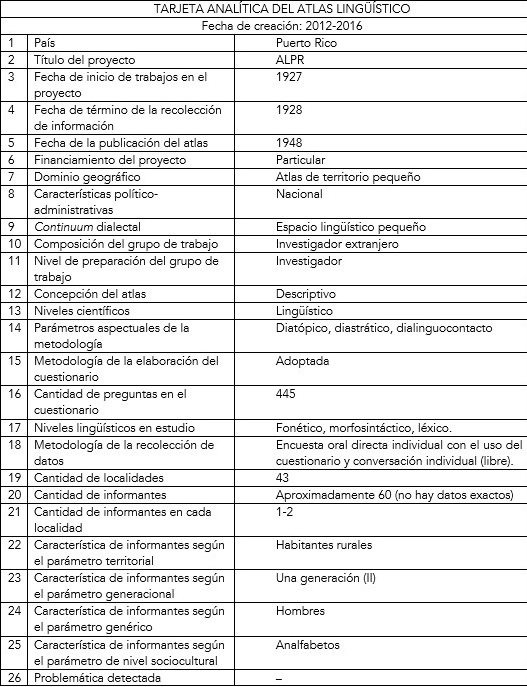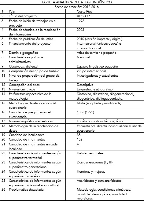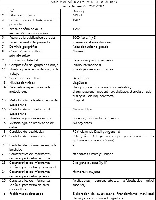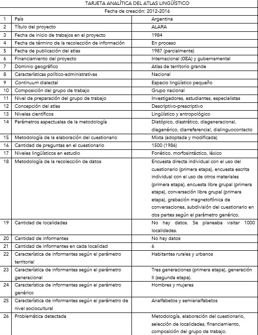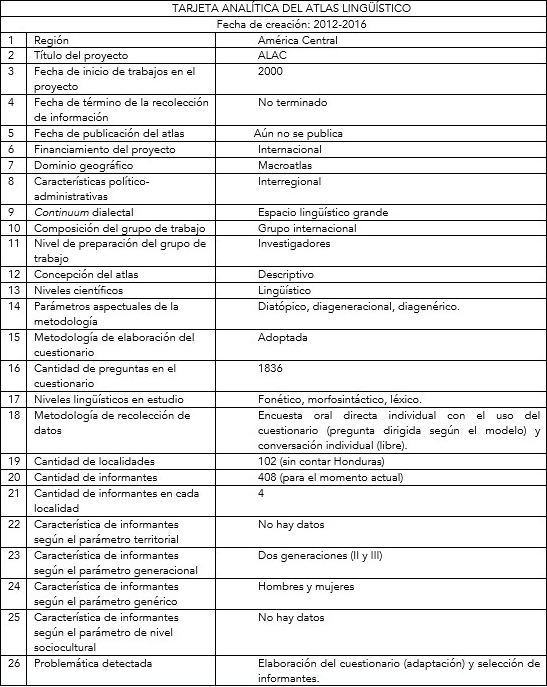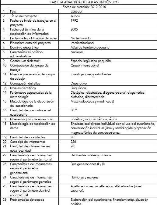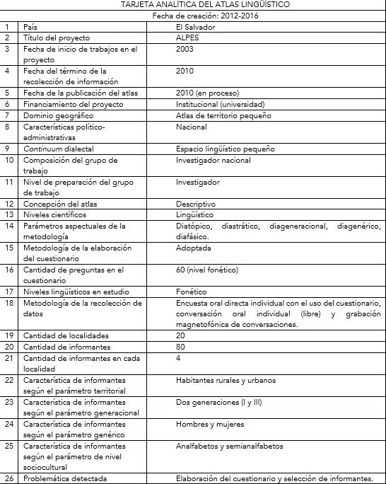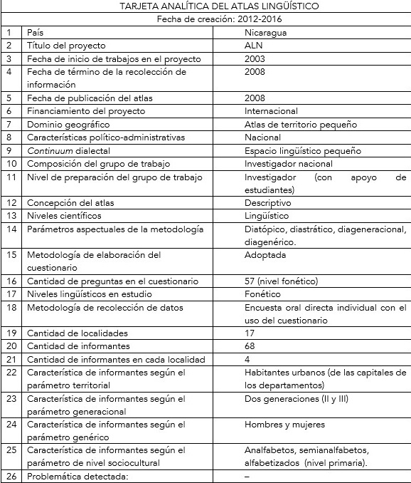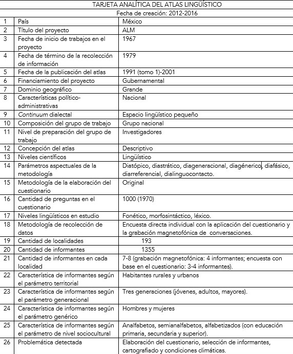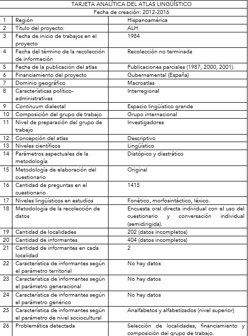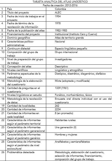 Para estos fines fue elaborado un instrumento descriptivo-analítico: la tarjeta analítica del atlas lingüístico, que refleja los principales parámetros específicos, éstos son: I. Cronología; II. Financiamiento del proyecto (la incorporación de este parámetro en la tipología se argumenta por su influencia en la calidad del atlas: disposición o ausencia de recursos materiales, cantidad de participantes, nivel de preparación, durabilidad del proyecto, densidad de la red de localidades y cantidad de informantes, todo esto lo entendemos como su confiabilidad; cabe mencionar que algunos de los proyectos examinados tuvieron financiamientos distintos o compartidos en varias etapas del trabajo, lo que influyó considerablemente en el resultado final); III. Características territoriales (III.1. La dimensión del territorio descrito, III.2. La característica político-administrativa del territorio); IV. Continuum dialectal del español; V. Participantes del grupo de trabajo (V.1. La composición del grupo de trabajo, V.2. El nivel de preparación de los participantes del grupo de trabajo); VI. Concepto del atlas (VI.1. Objetivos propuestos, VI.2. Niveles científicos); VII. Parámetros aspectuales de la metodología del atlas; VIII. Metodología del cuestionario; IX. Cuestionario; X. Niveles lingüísticos estudiados; XI. Metodología de recopilación de datos; XII. Localidades estudiadas;2 XIII. Informantes (XIII.1. Cantidad en cada localidad, XIII.2. Clasificación por su ubicación, XIII.3. Clasificación por generación, XIII.4. Clasificación por género, XIII.5. Clasificación de informantes por el nivel sociocultural); XIV. Clasificación por la problemática detectada.