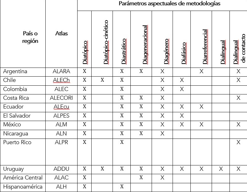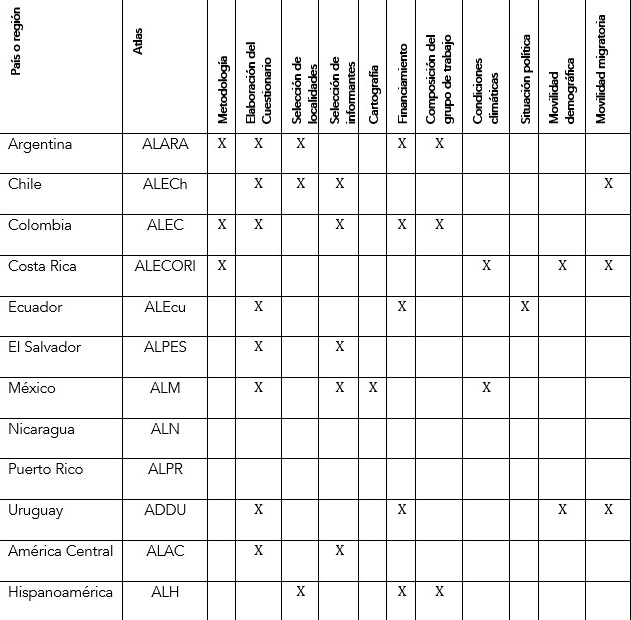 En el nuevo milenio se inicia otro proyecto interregional, el Atlas Lingüístico de América Central (2000), así como los proyectos geolingüísticos nacionales de Nicaragua y El Salvador (2003). La mayoría de los atlas lingüísticos citados utilizan metodologías adoptadas y modificadas. La excepción la constituye el Atlas Diatópico y Diastrático de Uruguay, en el cual fue aprobada la innovadora metodología de recolección y presentación pluriaspectual de la información de H. Thun. Ésta se considera y se usa, casi siempre, de manera parcial como parámetro para comparar todos los proyectos actuales de investigación relacionados con los atlas lingüísticos del español, como se muestra en la Tabla 1.