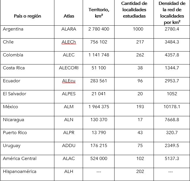 Por ser el análisis de todos los proyectos de atlas lingüísticos de Hispanoamérica una tarea demasiado grande, se decidió examinar en el presente artículo las principales investigaciones geolingüísticas. Éstas son las correspondientes a Argentina, Colombia, Costa Rica, México, Nicaragua, Puerto Rico, El Salvador, Uruguay, Chile y Ecuador, así como dos estudios interregionales: el Atlas Lingüístico de América Central y el Atlas Lingüístico de Hispanoamérica, realizados en el periodo de 1927 a 2010. La selección se debe al hecho de acceder a la información publicada, puesto que sin ver los proyectos semejantes de Venezuela, Cuba y Perú, de cuya existencia estábamos enterados, no se pudieron constatar los datos sobre la historia y el desarrollo de las actividades de investigación respectivas. Cabe aclarar que los márgenes cronológicos corresponden a la etapa inicial de los atlas lingüísticos en el territorio de Hispanoamérica, y que esta etapa es anterior al comienzo de la aplicación amplia de los medios de computación en proyectos semejantes.