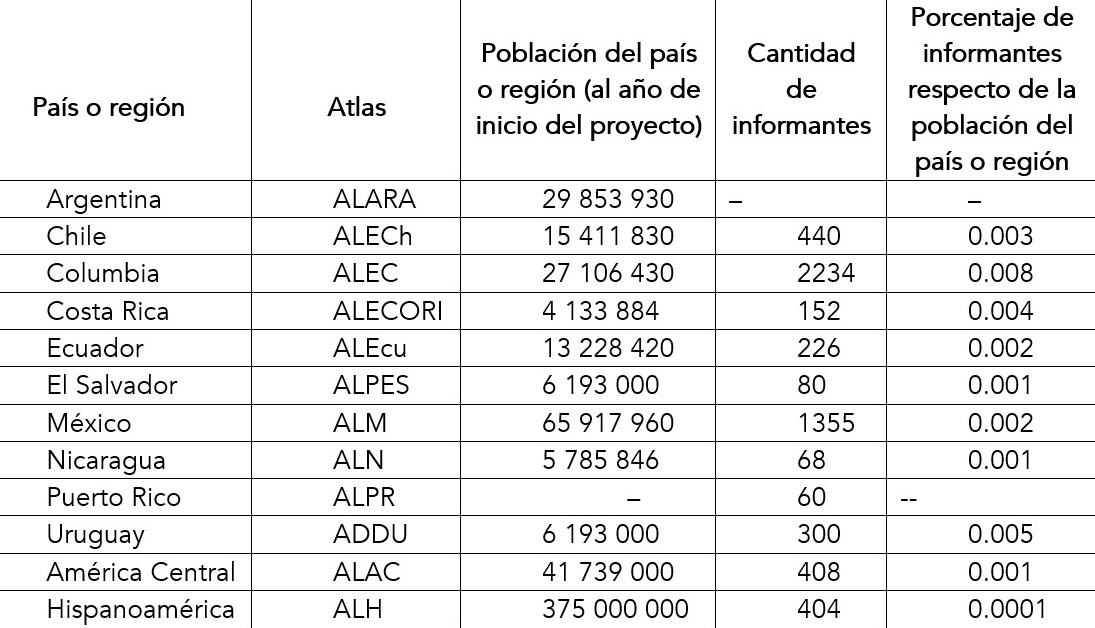 A partir de los resultados del análisis comparativo de los datos presentados en la Tabla 3 se puede llegar a la conclusión de que la mayor cantidad de informantes en relación con la población del país para el año de inicio del proyecto fue la del ALEC, y la menor la del ALH. Con esto, como lo demuestran los cálculos, el porcentaje de los informantes oscila entre 0.001 % hasta 0.005 % de la población del país.