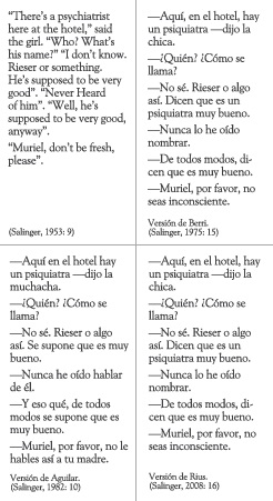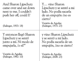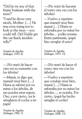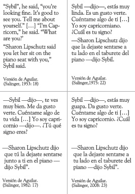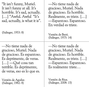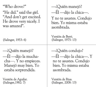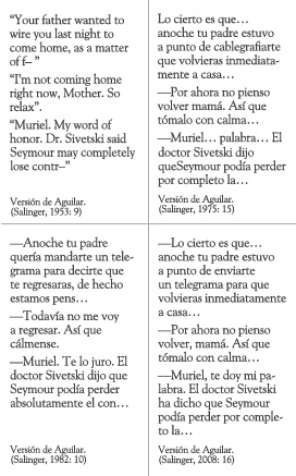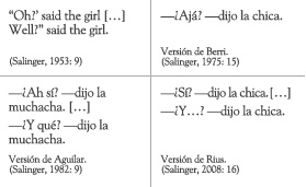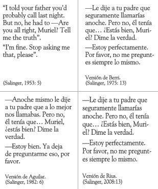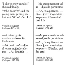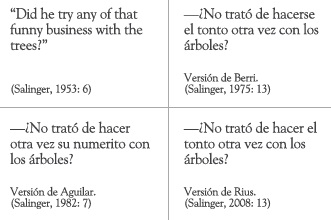 Puesto que uno de los rasgos principales en la narrativa de J. D. Salinger es la caracterización de sus personajes a través del diálogo, se analizarán algunos fragmentos en los que existen cambios significativos en las tres versiones. Para efectos prácticos y de orden, se englobarán los ejemplos en dos categorías: la primera será en la que ocurra un cambio de sentido, y la segunda, donde la elección limite, entorpezca o favorezca la naturalidad.
