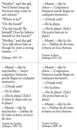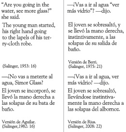 En cuanto a la traducción de Berri y Vanasco de “A Perfect Day…” —la primera en lengua española— se puede comentar, de manera general, que es fluida —es decir, corriente y fácil si se habla del estilo— y agradable de leer. Una de las características particulares es el concurrido uso de localismos que pudieran parecer extraños a los lectores de otros dialectos del español. Algunos de estos son “chinelas”, “bochinche”, “copetín”, “vaquillona”, “salida de baño”, “descerrajó”, etc. Otra peculiaridad de esta traducción es que en algunas partes del texto se aglutinan demasiadas oraciones subordinadas que hacen un poco más laboriosa la lectura. En ocasiones, el referente parece insertarse de manera forzada en la frase. Un ejemplo es el siguiente fragmento: “Mientras el teléfono llamaba, con el pincelito del esmalte se repasó la uña del dedo meñique, acentuando el borde de la luna. Tapó el frasco y, poniéndose de pie, abanicó en el aire su mano pintada, la izquierda” (Salinger, 1975: 11). Por último, en la traducción de Berri existen por lo menos dos usos de oraciones causativas que rompen con el tono conversacional del discurso y que se revisarán más adelante.