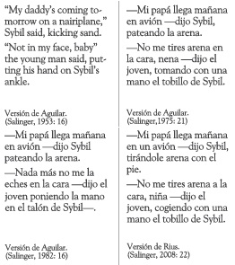 La versión de Rius es, quizá, la menos acertada. Además de cometer los mismos errores que se han señalado en Berri, agrega expresiones subidas de tono para Seymour, como “¡diablos!”, “no me tires arena a la cara, niña”, y “estás muy guapa”, dirigido a una pequeña de 5 o 6 años. La sintaxis de su traducción es un poco confusa y los personajes menos creíbles que en los otros dos traductores por la falta de naturalidad en sus diálogos. Es decir, estos carecen, en algunas ocasiones, de verosimilitud, y el lector puede percibirlo de inmediato.