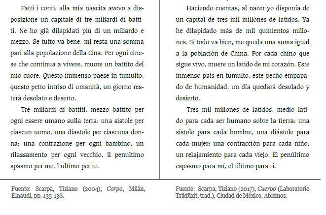 Scarpa, Tiziano (2017), Cuerpo (Laboratorio Trãduxit, trad.), Ciudad de México, Abismos.