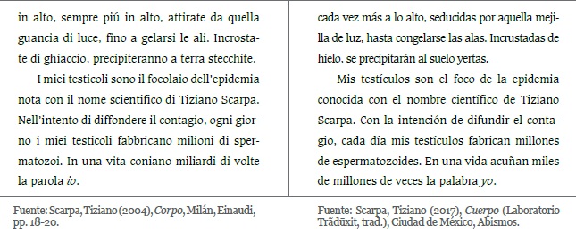 La traducción al español mexicano de los fragmentos de Corpo, de Tiziano Scarpa,1 que se incluyen en este documento es fruto del trabajo del Laboratorio Trãduxit, taller de traducción literaria colectiva del italiano al español que se coordina en el Instituto Italiano de Cultura Ciudad de México desde 2015. Dicho laboratorio cuenta con participantes presenciales y a distancia. En el taller que se impartió del 17 de febrero al 28 de abril de 2017 se contó con dieciséis participantes presenciales2 y dos a distancia,3 de Campeche, México, y de Rosario, Argentina. Al proyecto se sumaron también Monserrat Ferro —española, participante del más reciente taller— y Yoss —escritor cubano, admirador de la literatura de Tiziano Scarpa—, quienes se encargaron, respectivamente, de “iberizar” y “cubanizar” nuestra traducción de Cuerpo. Por esto, al final del laboratorio pudimos contar con cuatro traducciones distintas de un mismo texto: al español mexicano, realizada por los participantes presenciales; al español argentino y al español peninsular, a cargo de dos participantes a distancia; y al español cubano, elaborada por un escritor habanero.