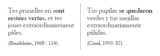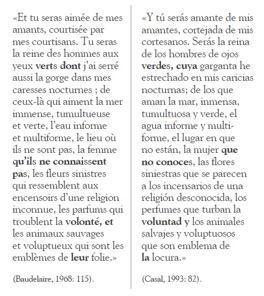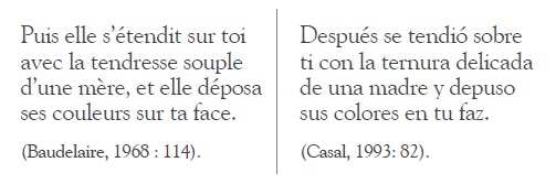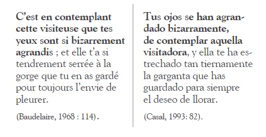 Continuando con el análisis, en la última parte del segundo párrafo, que citamos más adelante, cambia el orden de los componentes de la primera oración para cohesionar el texto; con ello se preserva la gramática española, ya que se evitó la traducción de en contemplant como gerundio en español, y se prefirió el infinitivo “de contemplar”. Se observa corrección sintáctica al evitar el empleo de una subordinación innecesaria que se habría presentado al traducir literalmente. Compárese la traducción literal del TO (“Es al contemplar a esta visitadora, que tus ojos son tan bizarramente agrandados”) con la que ofrece Casal. Hay que subrayar la elección que la pasiva refleja para dar cuenta del efecto de los colores lunares en los ojos verdes, idea que se subraya en el original con el empleo del pronombre de objeto directo en. También hay que resaltar el empleo del pretérito perfecto actual en lugar del presente para reforzar el efecto del acto de “contemplar”, con lo cual puede recuperarse el efecto de la partícula si, que enfatiza el sentido del adverbio bizarrement en el TO. Es evidente que el poeta busca que la traducción no le suene forzada al hablante hispánico, al tiempo que da cuenta del énfasis de la oración original, con su típica estructura de mise en relief.