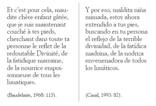 El segundo texto que analizaremos es “Le fou et la Vénus” (Baudelaire, 1968: 19-20), publicado en La presse el 28 de agosto de 1862. Una vez más podemos observar que el título preserva el sentido literal en la traducción. En el primer párrafo del TO se lee: “Quelle admirable journée! Le vaste parc se pâme sous l’oeil brûlant du soleil, comme la jeunesse sous la domination de l’Amour”, en tanto que en el TM se tradujo: “¡Qué admirable día! ¡El vasto parque se desmaya bajo la mirada ardiente del sol, como la juventud bajo el dominio del Amor!” Se observa que tradujo oeil por mirada. El ojo es algo tangible, el ojo sirve para ver, en tanto que la mirada alude a fijar la vista en algo. Cambia un poco la perspectiva, pero se conserva la prosopopeya como figura relevante en esta frase.