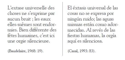 ¿Qué podría explicar la adición del relativo como? Si, como hemos visto, Julián del Casal se sujeta a una traducción casi literal, ¿qué pudo haber motivado este cambio? Una hipótesis es que, fiel al principio de que la traducción de las prosas de Baudelaire al español tendría que estar centrada en el texto, el cubano renunció a conservar la metáfora que pudo haberse expresado así: “las aguas mismas están adormecidas”. Quizás lo que pudo no agradar al poeta en esta traducción literal haya sido la cacofonía que produce el exceso del sonido de la ‘s’ en una frase tan corta, pues si ésta se analiza en el TO, se notará que sólo se pronuncia una vez el sonido ‘s’: “les eaux elles-mêmes sont endormies”. Al agregar como, la frase gana cadencia y el sonido se percibe con mayor armonía: “las aguas mismas están como adormecidas”. La pérdida es casi imperceptible, ya que se conserva la prosopopeya, a pesar de que en español la expresión estar como significa “parecer”, verbo cuyo sentido es distinto de estar.