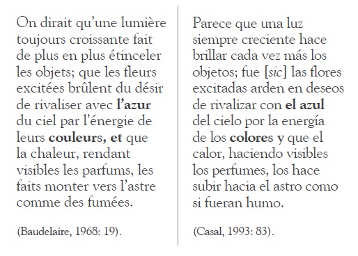 Es evidente que las decisiones que toma Casal son acordes con el texto original. Si bien muchos pasajes recibieron una traducción literal (pues requería poco esfuerzo en el procesamiento de la información), también se nota el conocimiento gramatical de ambas lenguas por parte del traductor, de modo que no se observan errores sintácticos sino, al contrario, una corrección lingüística. El traductor se ajusta al texto, respeta las ideas originales y toma las decisiones que permiten que el sentido quede intacto. Un ejemplo de esto es douce, la última palabra del párrafo mencionado, ya que ofrece al menos dos posibilidades de traducción al español: “dulce” y “suave”. El conocimiento implícito de la sensualidad de los textos baudelaireanos inclina al poeta a elegir lo táctil sobre lo gustativo.