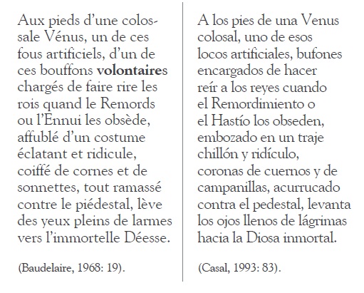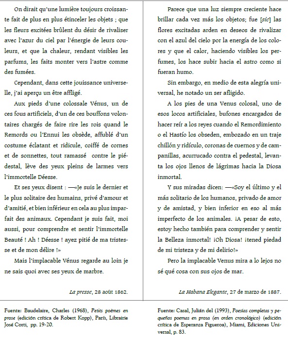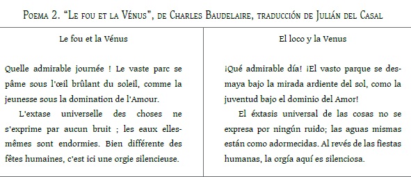 La última línea de este texto es muy interesante porque, en lugar de usar el término marbre = “mármol”, que es la sustancia de la que está elaborada dicha estatua, Casal lo transforma a su realidad, porque desde su isla (Cuba) lo que la Venus podría mirar con sus ojos de mármol es el mar; TO: “Mais l’implacable Vénus regarde au loin je ne sais quoi avec ses yeux de marbre”; TM: “Pero la implacable Venus mira a lo lejos no sé qué cosa con sus ojos de mar”. Quizá también el sonido de la palabra mar inclinó a Casal a elegir esta opción, pues con mármol se agrega una sílaba más y otros sonidos; cambia quoi por cosa, de manera que se logra una oración cadenciosa en español.