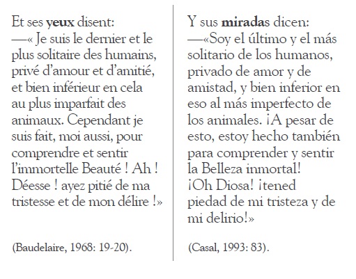 Más adelante puede notarse que hay una modulación al traducir yeux, un término concreto, por “miradas”, una noción más abstracta y sutil, que queda muy bien en el contexto en que se usa, ya que subraya la expresividad de los ojos. Perduran las miradas en lugar de los ojos, lo intangible en lugar de lo corpóreo.