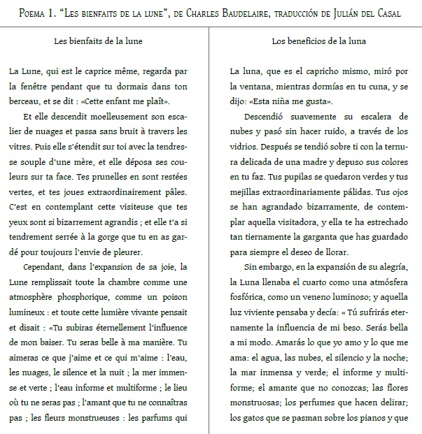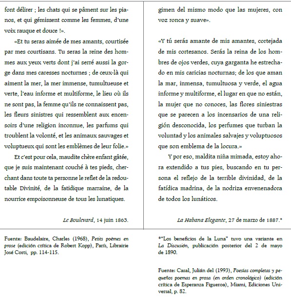 Primero se analiza la traducción de “Les bienfaits de la lune”, publicado en Le Boulevard el 14 junio de 1863 (la edición utilizada para este análisis es la de Robert Kopp de 1968) y traducido al español con el título “Los beneficios de la luna”, publicado en La Habana Elegante el 27 de marzo de 1887 (texto original extraído de la edición crítica de Esperanza Figueroa de 1993). Se seguirá el orden consecutivo en el que aparecen los párrafos.