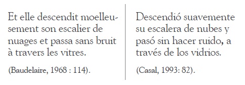 La traducción es casi literal; no existe la necesidad de modificar demasiado el texto, y no pierde sentido. Se observa la adición de una coma en la traducción para separar el complemento circunstancial “a través de los vidrios”. Quizá esto lo hace el traductor para marcar el ritmo contrastante entre la primera oración y la copulativa que aparece después del nexo (et / y), pues la primera es más extensa que la segunda en el original. La primera oración tiene en la traducción el mismo número de sílabas que en el original (15). La necesidad de emplear la perífrasis verbal “sin hacer ruido”, en lugar de la frase nominal “sans bruit”, así como la exigencia de la preposición (de) en la frase “a través de” por “à travers” incrementa a 15 el número de sílabas de la segunda oración (en el original son 11), así que para marcar esta asimetría, Casal pudo haber recurrido a la coma mencionada.