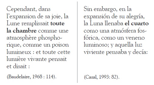 La palabra Luna en esta parte del escrito aparece con mayúscula, a diferencia de la primera aparición en la traducción comentada. El cambio de la minúscula al inicio del poema a la mayúscula al final muestra un proceso mediante el cual este simbólico elemento astral emerge en el poema como una prosopopeya. Por otra parte, la traducción de “toute la chambre” de manera literal hubiese requerido demasiadas sílabas (toda la recámara), de modo que el traductor elige abreviar empleando como sinónimo “el cuarto”. Esto evidencia una atención particular al elemento composicional del ritmo de la frase.