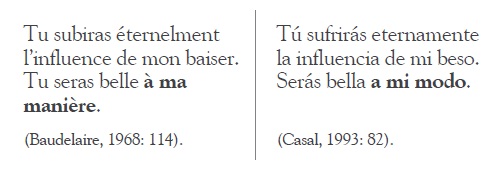 Asimismo, se observa otra traducción no literal en el siguiente extracto, porque la frase “à ma manière” fue traducida por “a mi modo”. Aquí especulamos que probablemente Casal eligió como sinónimo la frase más corta “a mi modo” para no extender tanto el periodo en español, pues si se compara el número de sílabas, el TO tiene 22 y la traducción de Casal, 24 (contando sinalefa en la-influencia). Al elegir esta frase, en lugar de la literal “a mi manera”, ahorra una sílaba y conserva cierta asonancia con beso / modo, al igual que en el original (baiser / manière):