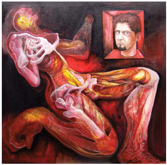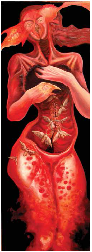 Lo feo y lo bello convergen en una deconstrucción pictórica que también nos muestra algo a lo que no podemos acceder. Quizá se trata de la vida íntima del artista, que permanece un tanto oculta incluso para él mismo; por ello la plasma, para encontrar aquello que está ahí. Para los espectadores ese algo permanece latente y a la vista, como en los objetos puntiagudos y huesos de animales que aparecen en algunas de las pinturas. La mirada de espectador nos vuelve cómplices del artista, porque nos invita a descender a sus sueños a través de nuestra vigilia, percibiendo una realidad fragmentada, pero no incompleta. El arte de Asdrúbal es una especie de soliloquio donde las preguntas existenciales que él se hace quedan manifestadas en imágenes sin res- puesta; sin embargo, la existencia y su arte nos demuestran que la vida es una construcción mutable, que los cuadros percibidos son instantes en los que el artista se busca y a veces se encuentra, pero otras sólo deja su rastro en el lienzo donde los sueños, la vida y las pesadillas convergen en huellas que marcan un monstruoso camino.