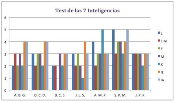 A continuación se detallan los resultados obtenidos por el alumnado en lo referente a las siete inteligencias: Lingüística (L.), Lógica Matemática (L.M.), Espacial (E.), Musical (M.), Kinésico corporal (K.), Interpersonal (IE) e Intrapersonal (IA):