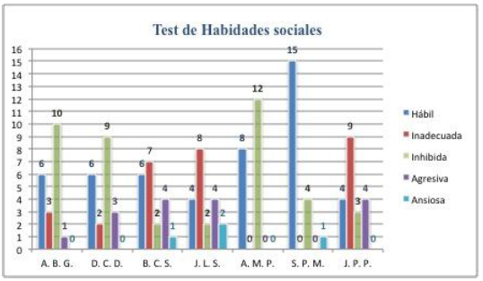 En definitiva, el estudio de los test corrobora que en general el grupo carece de las habilidades sociales (quizás fundamentalmente por su baja autoestima) básicas para establecer relaciones grupales, que no saben comportarse en clase, ya que sus conductas son disruptivas (especialmente J. L. y J. P.) o excesivamente inhibidas (Á. B. o A. M.) y que carecen de empatía, por lo que no son capaces de reconocer los estados de ánimo o necesidades de sus compañeras y compañeros.