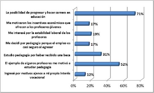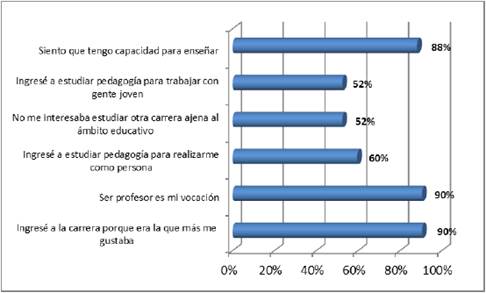Cerca de la mitad (52%) indica que ingresó a estudiar Pedagogía por el hecho de trabajar con gente joven, un porcentaje equivalente señaló que no le interesaba estudiar otra carrera ajena al ámbito educativo. Por último, más de la mitad (60%) expresa que el hecho de estudiar pedagogía constituye una forma de realización personal.